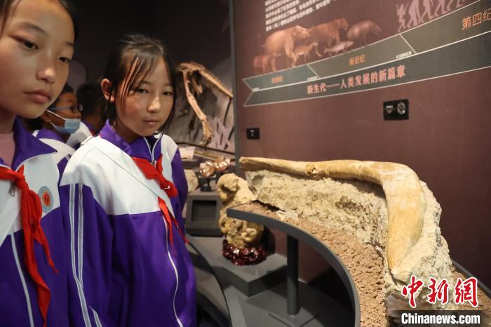圖為青少年了解產(chǎn)自青海省的黃河象牙化石。張?zhí)砀?攝