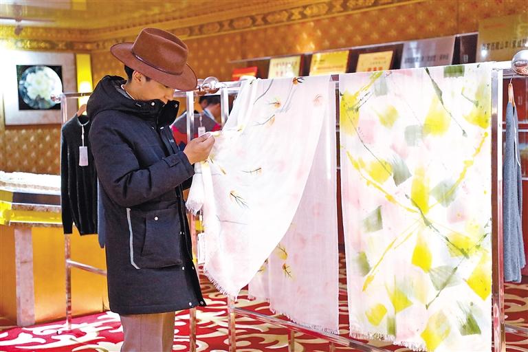 圖為消費(fèi)者在措勤縣絨山羊良種擴(kuò)繁養(yǎng)殖場(chǎng)展覽廳挑選“金紫絨”羊絨制品。記者 永青 攝