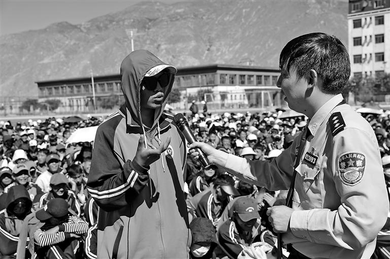 宣傳活動中,拉薩市第一中等職業(yè)技術(shù)學(xué)校學(xué)生和區(qū)公安廳網(wǎng)安總隊(duì)民警熱情互動。記者 彭琦 攝