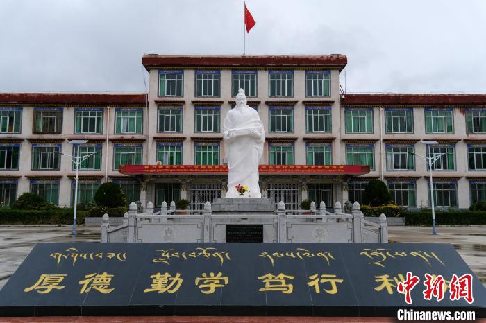 10月12日,西藏藏醫(yī)藥大學(xué)校園內(nèi)矗立的藏醫(yī)藥學(xué)祖師宇妥·寧瑪云丹貢布雕像和藏漢雙語鐫刻的校訓(xùn)。中新社記者 江飛波 攝