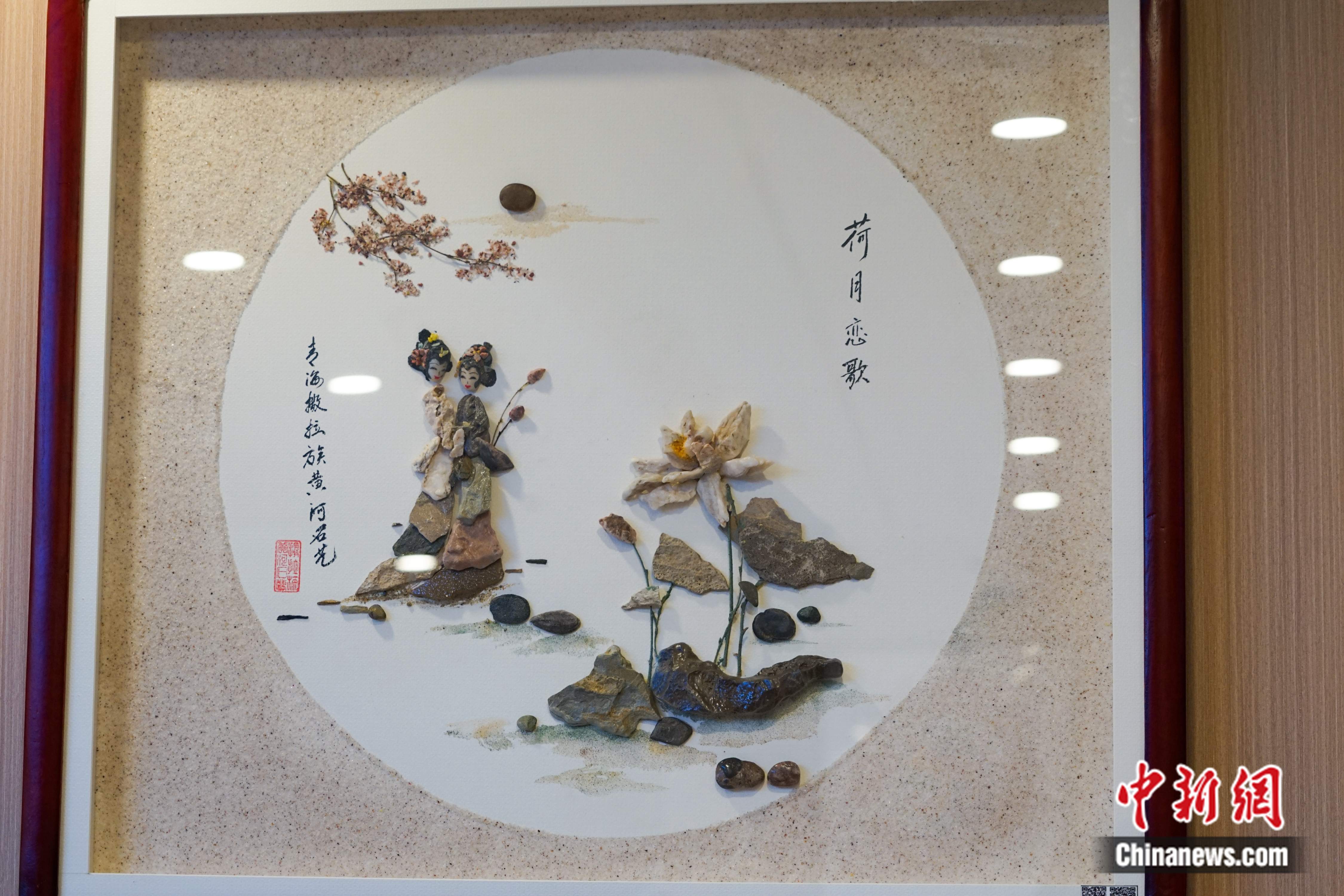 墻上懸掛的青海省民族團(tuán)結(jié)進(jìn)步形象標(biāo)識,由多種少數(shù)民族刺繡共同制作而成;撒拉族婦女純手工制作的黃河石藝畫色調(diào)古雅、未經(jīng)雕琢,畫面呈現(xiàn)天然立體感,意境悠遠(yuǎn)朦朧。
