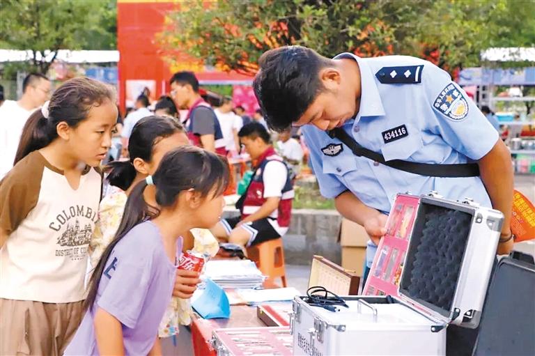 圖為民警在為小朋友們介紹警用裝備。記者 張猛 攝