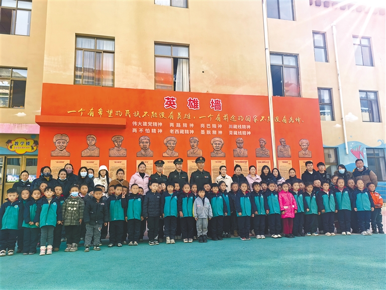 近日,西藏軍區(qū)某部為拉薩市城關(guān)區(qū)第四幼兒園援建英雄墻,舉行剪彩儀式,并向?qū)W生們生動(dòng)講述英雄墻上11位英雄的光榮故事,引導(dǎo)孩子們崇尚英雄,傳承紅色基因?!?/p>