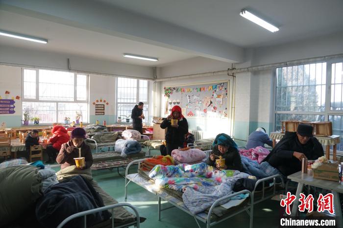 12月20日,青海省海東市民和縣中川鄉(xiāng)美一小學(xué)安置點(diǎn)內(nèi)民眾正在就餐。馬銘言 攝