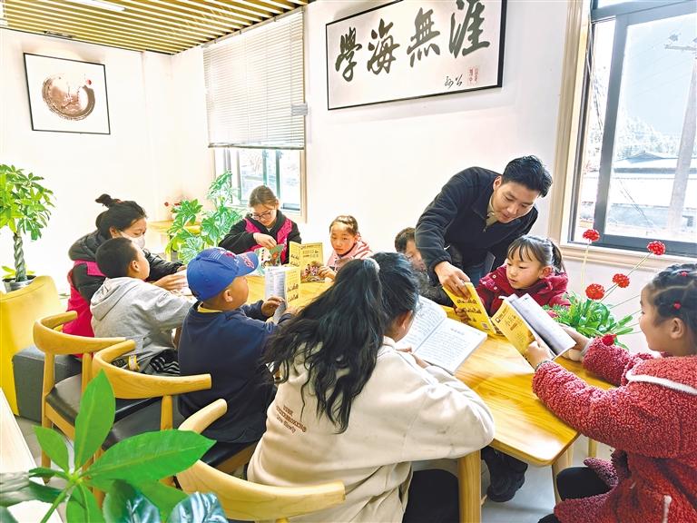 新時(shí)代文明實(shí)踐志愿服務(wù)隊(duì)成員在扎拉村農(nóng)家書屋輔導(dǎo)孩子閱讀書籍。