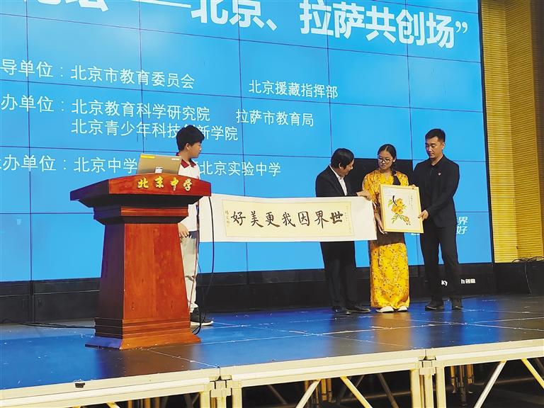 圖為拉薩北京實(shí)驗(yàn)中學(xué)學(xué)生向友好學(xué)校贈送禮物。