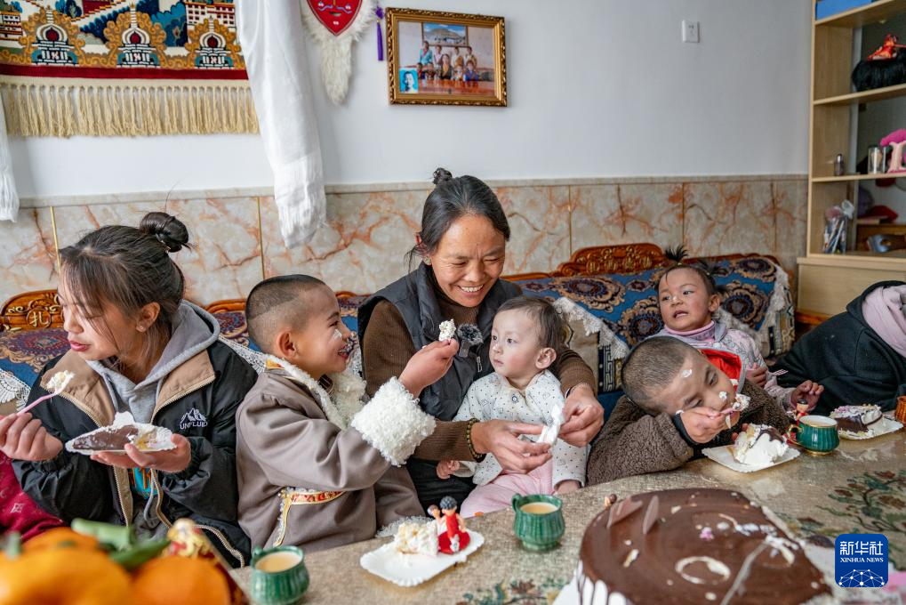 1月8日,巴桑和孩子們一起吃蛋糕。新華社發(fā)(丁增尼達(dá)攝)