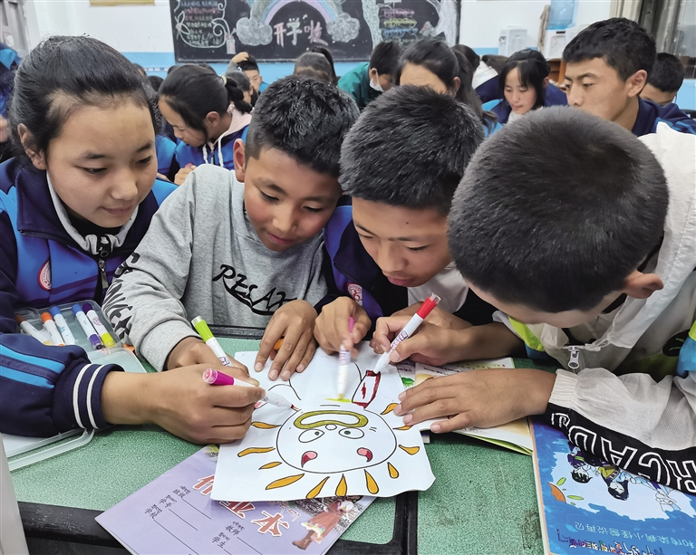 “通過拉巴卓瑪?shù)倪@幅畫,我了解到她是一個很有想法的孩子,她很清楚自己想要什么。課程剛開始時,我觀察到她一個人坐在角落里,低著頭,也不怎么和旁邊同學(xué)說話,但是通過這個課程的開展,她會在課后主動跑來和我說她近期遇到的困惑,我感覺到她正逐漸敞開心扉,這與我們當(dāng)初開設(shè)這個課程的初心是一樣的。我們就是希望可以通過這些課程,讓當(dāng)?shù)氐膶W(xué)生在心理方面得到更多的開導(dǎo)、正視自己的情緒,并從中去獲得一些能量,所以現(xiàn)在看到她的變化,我很高興?!蓖蹑兼谜f。