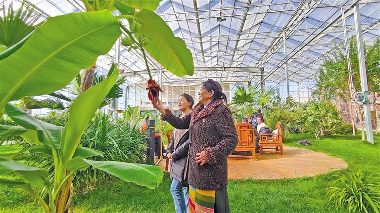 隆冬時(shí)節(jié),山南市扎囊縣阿扎鄉(xiāng)的南方植物展示館內(nèi),一派郁郁蔥蔥的景象。椰子樹、鶴望蘭、凌霄花相映成趣。該館是藏草萬畝植物種苗繁育基地的一部分,可為參觀游客提供林草科普知識(shí)講解,為學(xué)生開設(shè)生態(tài)課堂進(jìn)行研學(xué)實(shí)踐等。
