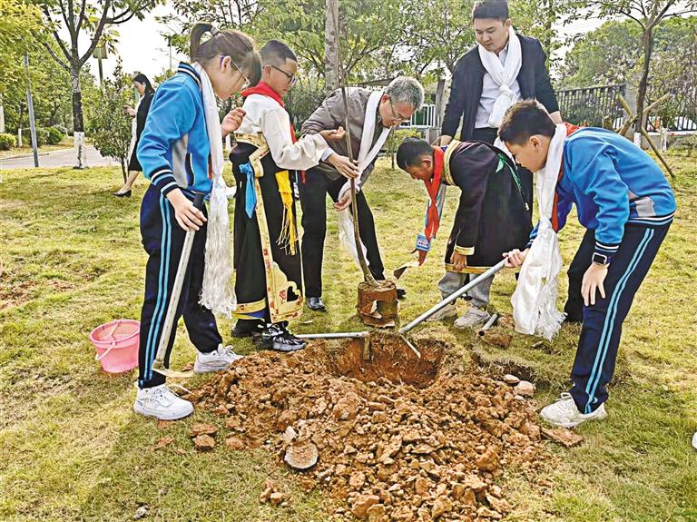 圖為“莞宜情·山海行”莞宜各族青年互訪交流活動中,東莞、巴宜兩地青少年共同種下團結(jié)之樹。