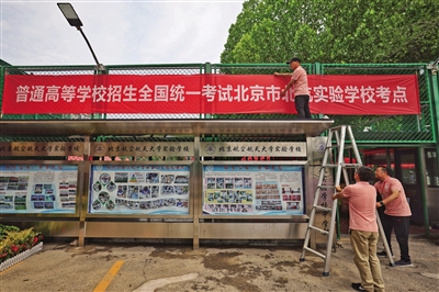 6月6日,記者在北京航空航天大學(xué)實(shí)驗(yàn)學(xué)校中學(xué)部(簡稱“北航實(shí)驗(yàn)學(xué)校”)考點(diǎn)看到,學(xué)校西門處已懸掛起高考考點(diǎn)橫幅、考場布置已就位,校園內(nèi)放置了多個溫馨的提示語標(biāo)牌。據(jù)悉,該校是今年新增高考考點(diǎn)之一,承接來自9所學(xué)校277名考生的高考組考任務(wù)。此外,記者還探訪了北京高考人大附中經(jīng)開學(xué)??键c(diǎn)
