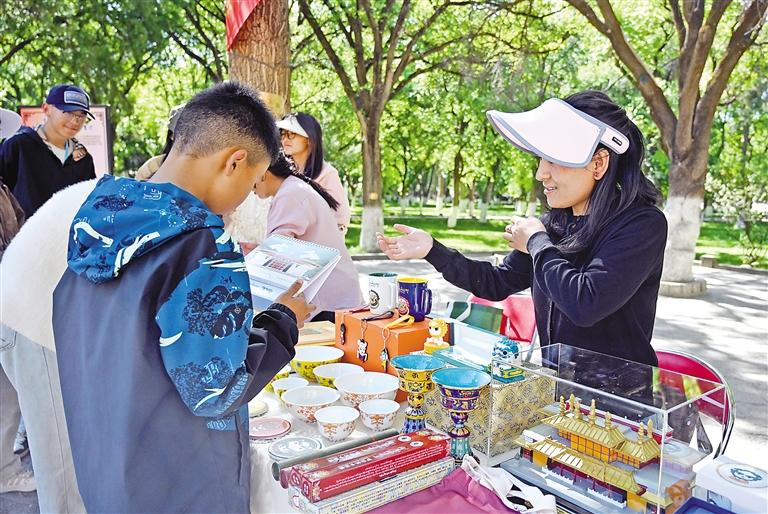 在拉薩市羅布林卡內(nèi),工作人員為群眾介紹文創(chuàng)產(chǎn)品。記者 旦增蘭澤 攝