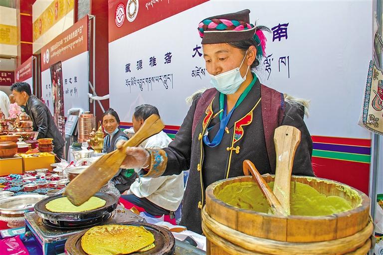 在日喀則市非遺展銷現(xiàn)場(chǎng),展商在制作蕎麥餅。記者 旦增嘎瓦 楊子彥 扎西頓珠 攝