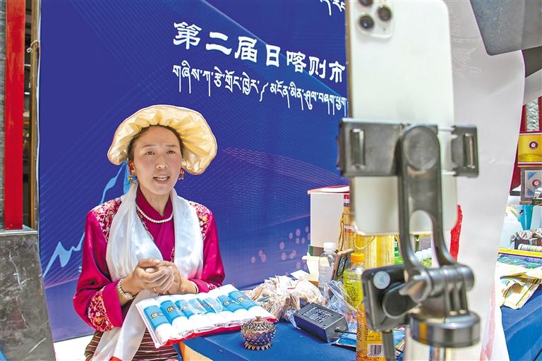 在日喀則市非遺展銷現(xiàn)場(chǎng),主播通過(guò)直播為網(wǎng)友介紹非遺特產(chǎn)。記者 旦增嘎瓦 楊子彥 扎西頓珠 攝
