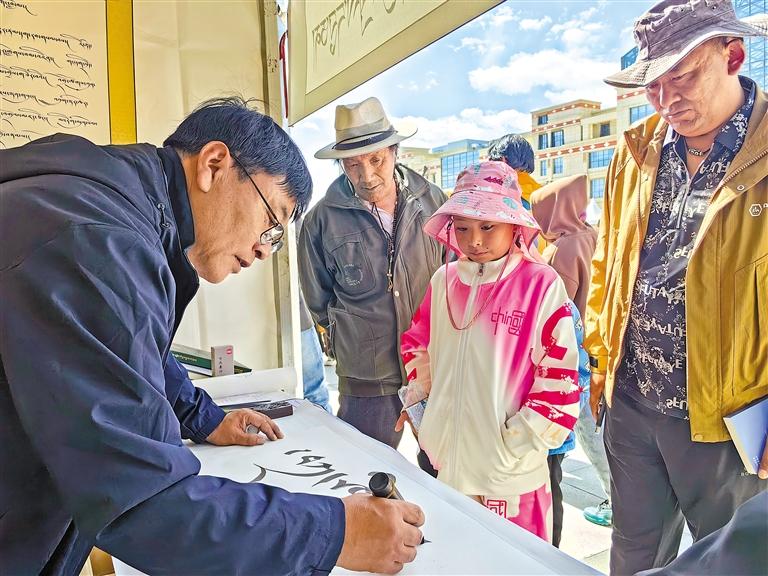在那曲市團(tuán)結(jié)廣場(chǎng),群眾感受藏文書法魅力。記者 趙書彬 攝