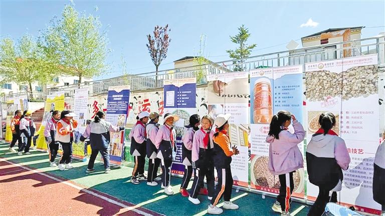 昌都市貢覺(jué)縣中心小學(xué)學(xué)生參觀非遺展板。記者 平措郎加 攝
