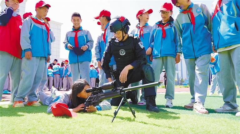 圖為巴宜區(qū)中學(xué)學(xué)生在特警隊(duì)員指導(dǎo)下沉浸式體驗(yàn)警用裝備?;菖魏?記者 彭琦 攝