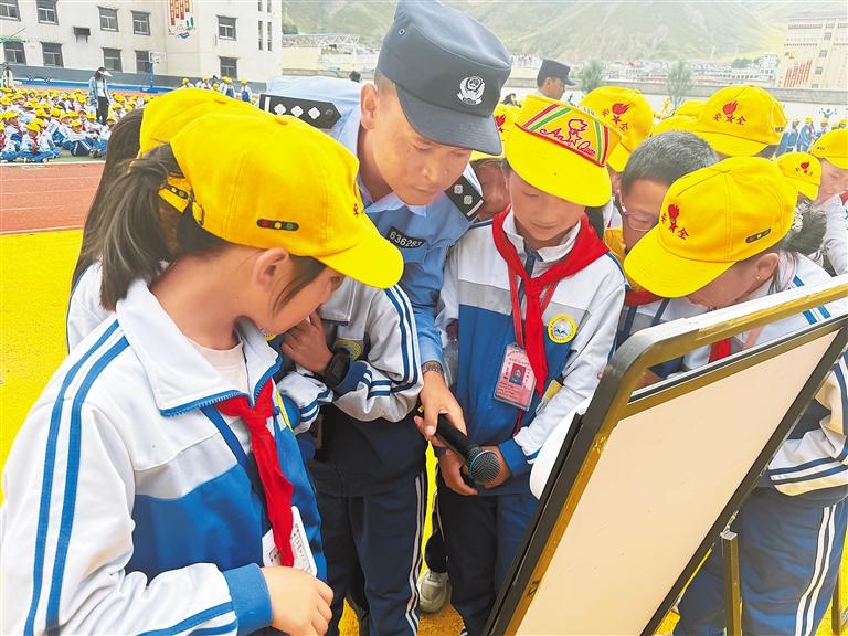 圖為那曲市索縣禁毒民警正在向轄區(qū)學(xué)校的師生宣講禁毒相關(guān)內(nèi)容。記者 萬靖 攝