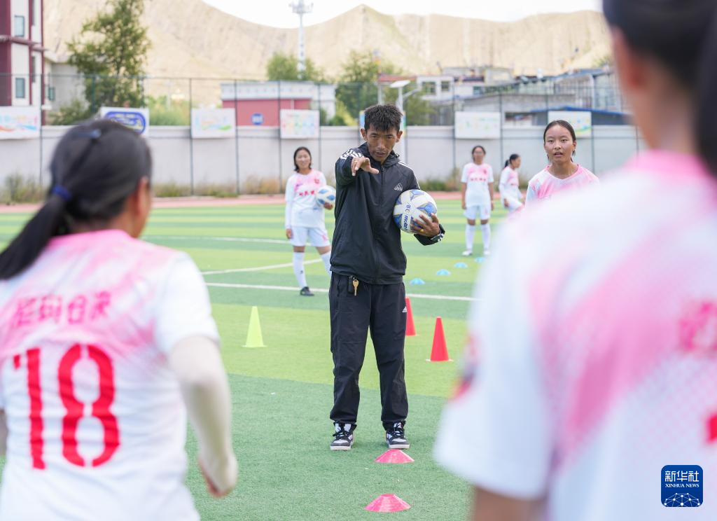 西藏日喀則市上海實(shí)驗(yàn)學(xué)?!爸榉逖棥迸幼闱蜿?duì)教練洛布桑在操場(chǎng)上指導(dǎo)球員訓(xùn)練(9月3日攝)。新華社記者 丁汀 攝