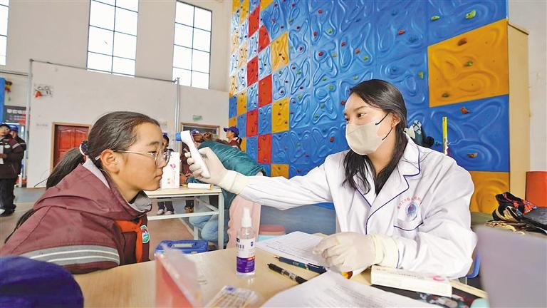 接種疫苗后,醫(yī)生在留觀區(qū)為學(xué)生測量體溫。記者 格桑倫珠 攝
