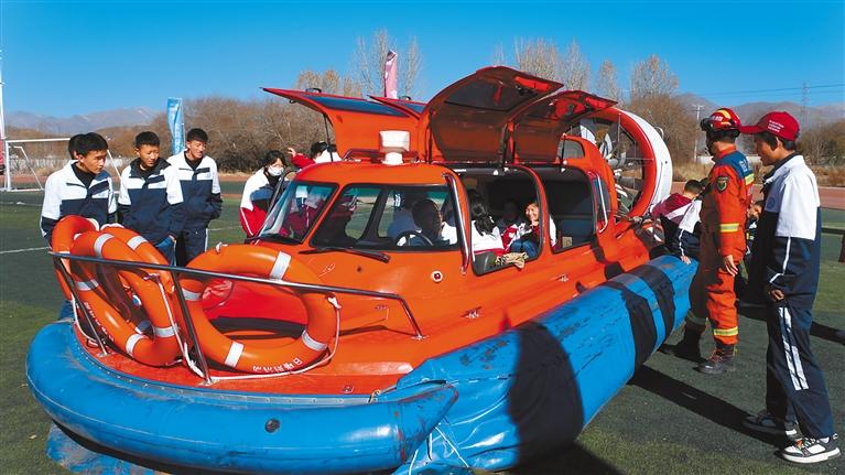 學(xué)生體驗(yàn)消防救援艇。