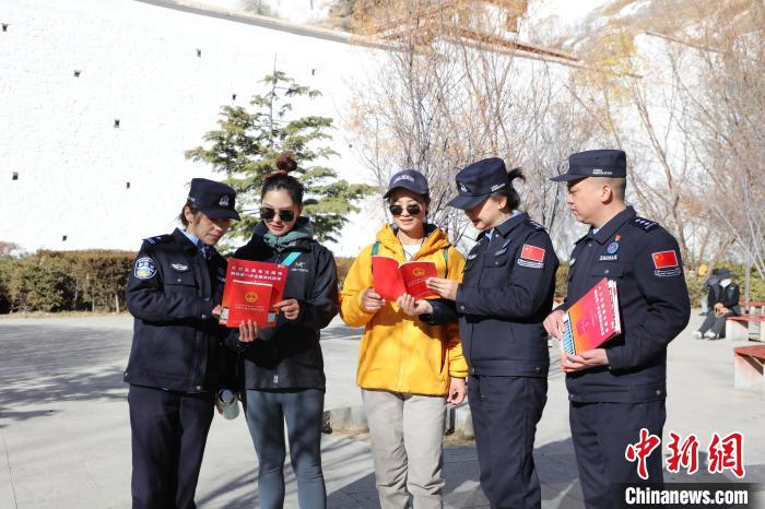 圖為西藏邊檢總站執(zhí)法調(diào)查支隊(duì)法制民警向游客普及憲法知識。徐錫萬 攝