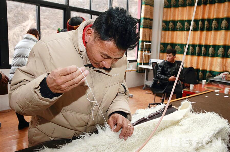 圖為扎西江村師傅手工縫制藏裝 攝影:陳衛(wèi)國(guó)