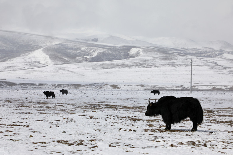 時已暮春,但在高寒牧區(qū)天然草場,草還沒發(fā)芽,洛絨赤乃只好讓牛在雪地里啃冬天留下的枯草。雖然定居點(diǎn)牛棚里有儲存的人工飼草,但還是要備不時之需,因為春夏之交還會經(jīng)常下雪,也是牦牛最難熬的時節(jié)。