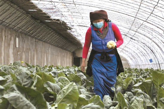 圖為當(dāng)?shù)厝罕娫谀窆たh現(xiàn)代農(nóng)業(yè)示范園溫室大棚收花菜。 拉薩融媒記者 貢嘎來(lái)松攝