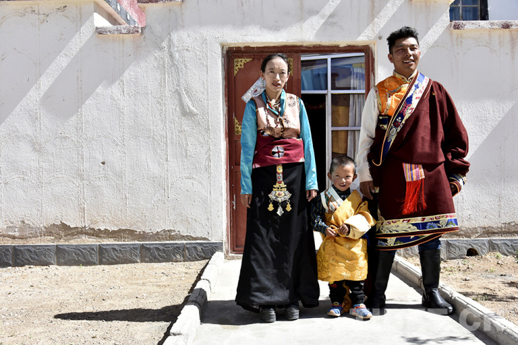 圖為西藏自治區(qū)阿里地區(qū)改則縣圓夢新居易地扶貧搬遷點居民扎西頓珠和妻子以及小兒子在家門前合影 攝影:王媛媛