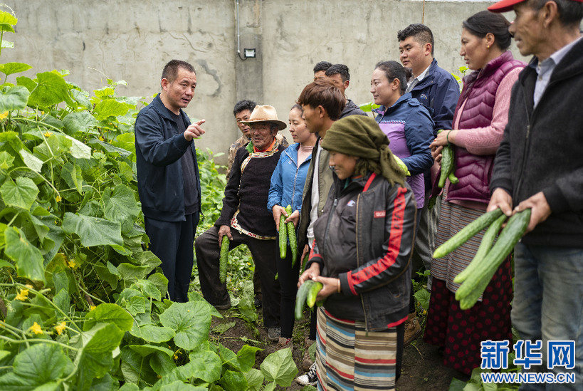7月30日,西藏自治區(qū)供銷合作社社有企業(yè)負責人趙全(左一)給當?shù)厝罕娭v解蔬菜種植知識。新華社記者 普布扎西 攝