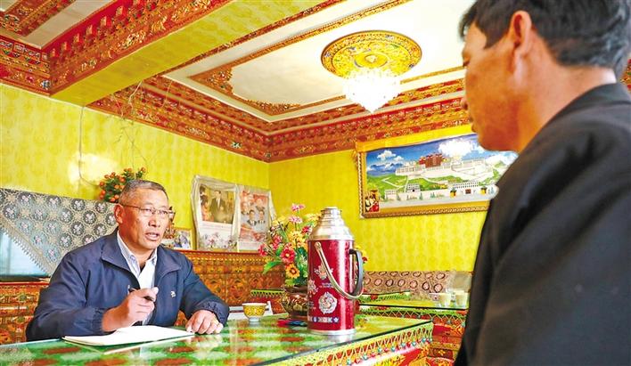 通嘎社區(qū)“四講四愛(ài)”宣講員阿瓊在了解米瑪脫貧致富的故事。記者 劉斯宇 格桑倫珠 攝