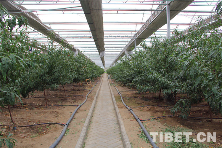 在高原上栽好一棵桃樹需要傾注更多的心血。經(jīng)過大棚的中控室,王榮華說:“這里晝夜溫差大、紫外線強,冬天的時候還要澆凍水、拉膜蓋土、給樹打防凍液,在高原發(fā)展果樹種植困難不少。不同于內地的桃樹,在這里快4年了,露天的桃樹只長高兩三米。”說到這里,他不由感慨科技種植的力量:“大棚里的桃樹一年就長到3米多高,并且掛果了?;叵?017年時,露天種下的桃樹只有手指粗細,如今長勢這么好,真有點不可思議。”