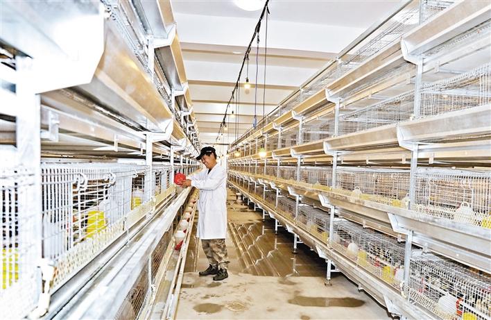 圖為拉孜縣曲瑪鄉(xiāng)拉孜拉貴藏雞養(yǎng)殖孵化保種有限責任公司的員工給藏雞投食。記者 次旺 唐斌 攝