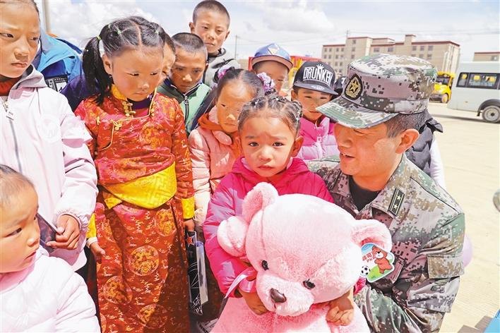 西藏那曲軍分區(qū)官兵在給孤兒院的孩子們送禮物