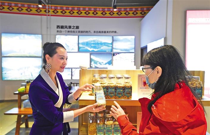 開館當(dāng)日,展銷人員身著盛裝詳細(xì)介紹了來(lái)自雪域高原的類烏齊牦牛肉干、卡若香豬臘肉、水磨糌粑、那曲蟲草、索多西辣椒醬、達(dá)美擁葡萄酒、察雅蘋果醋等300余種西藏特色農(nóng)特產(chǎn)品和易貢藏刀、丁青象牙玉器、墨脫石鍋、左貢木碗、藏毯、藏靴、藏香等近100種民族手工藝品,琳瑯滿目的民族特色產(chǎn)品吸引了不少市民駐足選購(gòu)。
