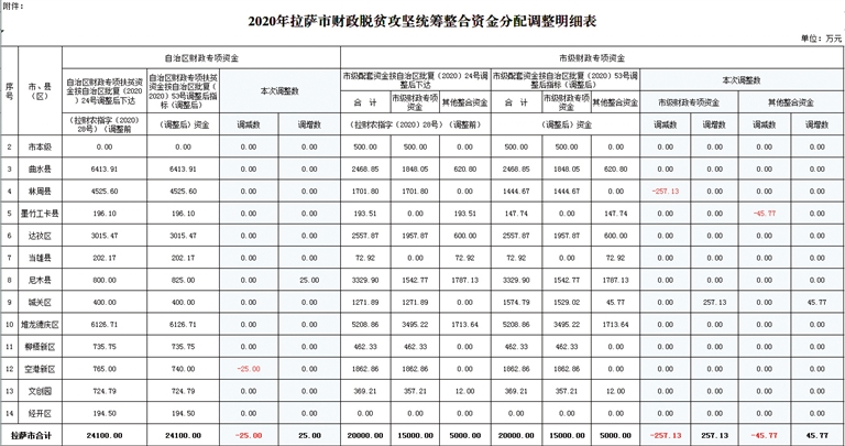 附件:2020年拉薩市財(cái)政脫貧攻堅(jiān)統(tǒng)籌整合資金分配調(diào)整明細(xì)表
