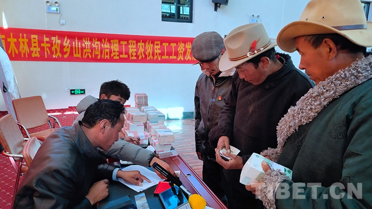 圖為西藏自治區(qū)日喀則市南木林縣卡孜鄉(xiāng)山洪溝治理工程項目民工工資發(fā)放暨勞務(wù)合作社分紅儀式現(xiàn)場