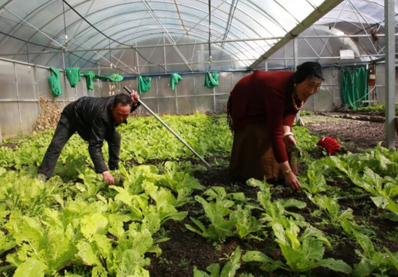 圖為嘎達(dá)彭措(左一)與妻子在蔬菜大棚忙碌 圖片來(lái)源:康巴傳媒