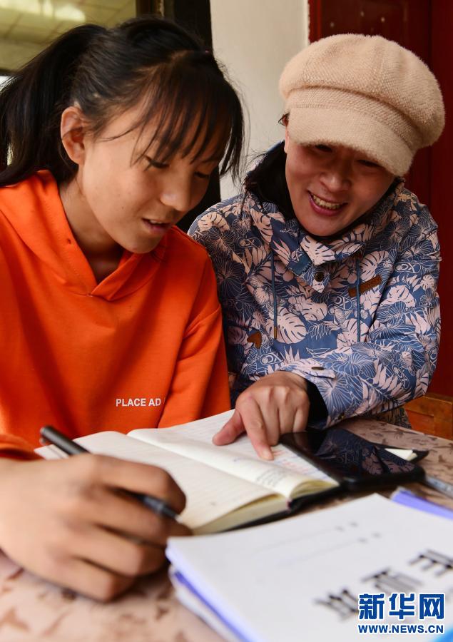 2020年3月26日,在西藏林芝市朗縣扎西塘村的一戶(hù)建檔立卡貧困戶(hù)家中,西藏林芝市委宣傳部駐村工作隊(duì)員何曉雪(右)正在為學(xué)生輔導(dǎo)功課。 新華社發(fā)(索朗羅布 攝)