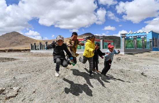 在我國海拔最高的行政鄉(xiāng)——西藏山南市浪卡子縣普瑪江塘鄉(xiāng),小朋友們?cè)谛陆ǔ傻挠變簣@前玩耍。記者 晉美多吉 攝