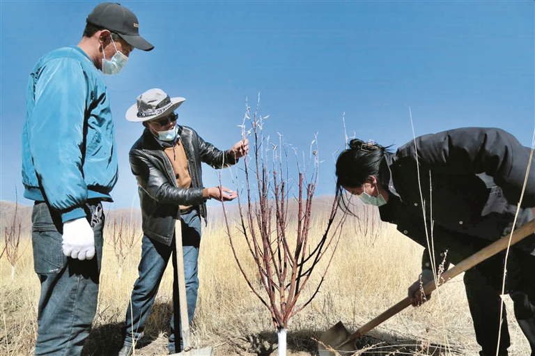 “果樹(shù)要修剪,每年開(kāi)春都要剪掉干枯枝、病枝、細(xì)弱枝、重疊枝、去年掛果枝等,保留健康新生枝,這樣秋季果樹(shù)便會(huì)碩果累累……”工卡村第一書(shū)記李學(xué)龍一邊拿著剪刀修剪果樹(shù),一邊給村民們傳授果樹(shù)修剪、覆土保墑、澆水施肥、防止鼠害等經(jīng)驗(yàn)。李學(xué)龍是一名退伍兵人,森林防火滅火、野生動(dòng)植物保護(hù)、植樹(shù)造林綠化都是他的“老本行”,在工卡鎮(zhèn)擔(dān)任第一書(shū)記后,他還跟著拉薩市林業(yè)綠化局專(zhuān)業(yè)人員學(xué)習(xí)了果樹(shù)栽培、修剪等技術(shù)。