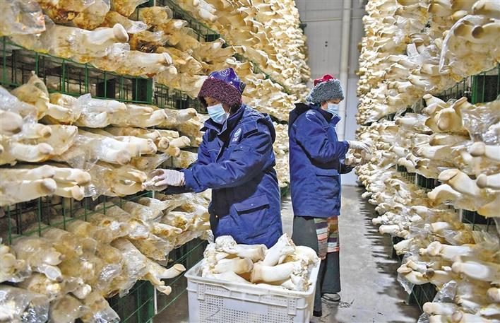 日喀則市珠峰一見則喜生物科技示范園區(qū)內(nèi)工作人員在采摘杏鮑菇。