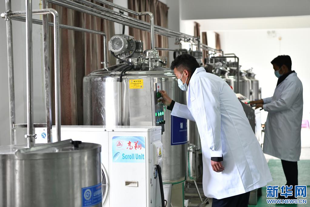 工作人員在西藏娘亞牦牛養(yǎng)殖產(chǎn)業(yè)發(fā)展有限責任公司的酸奶生產(chǎn)車間作業(yè)(7月28日攝)。新華社記者 李鑫 攝
