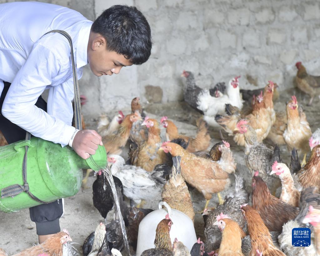 9月15日,西藏定結(jié)縣陳塘鎮(zhèn)養(yǎng)雞場(chǎng)工作人員扎旺給藏雞喂水。新華社發(fā)(索朗羅布 攝)