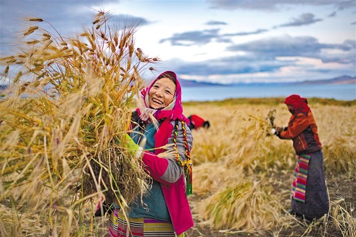 9月23日,西藏那曲市尼瑪縣文部鄉(xiāng)文部南村村民開鐮收割農(nóng)田里的青稞。文部鄉(xiāng)文部南村位于當(dāng)惹雍錯(cuò)湖畔,海拔4645米。文部鄉(xiāng)一帶獨(dú)特的自然環(huán)境,在以牧區(qū)為主的藏北,造就了這片罕見的農(nóng)田。