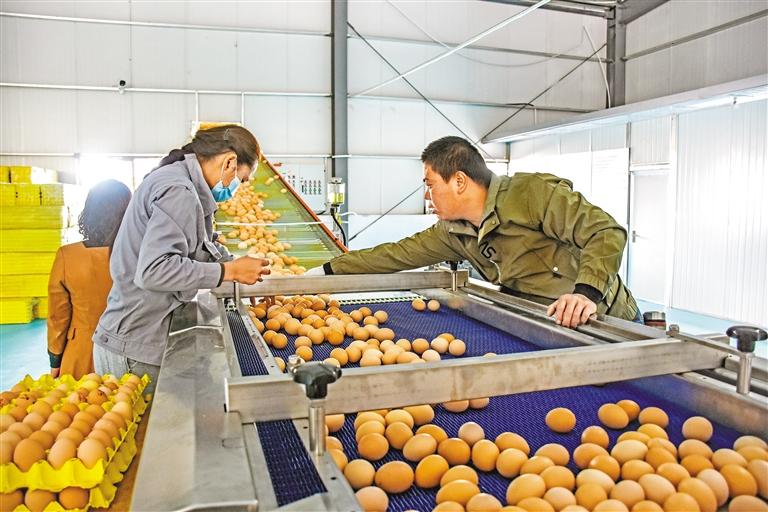 圖為就業(yè)群眾和技術員在西藏宏農百萬羽全智能化藏雞產業(yè)園的流水線上篩檢成品雞蛋。 記者 劉楓 攝