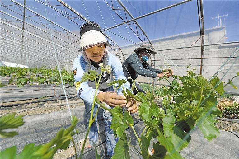 圖為乃東區(qū)頗章鄉(xiāng)村民在哈魯崗百畝農(nóng)業(yè)產(chǎn)園內(nèi)的葡萄園里剪枝。 記者 楊小娟 攝