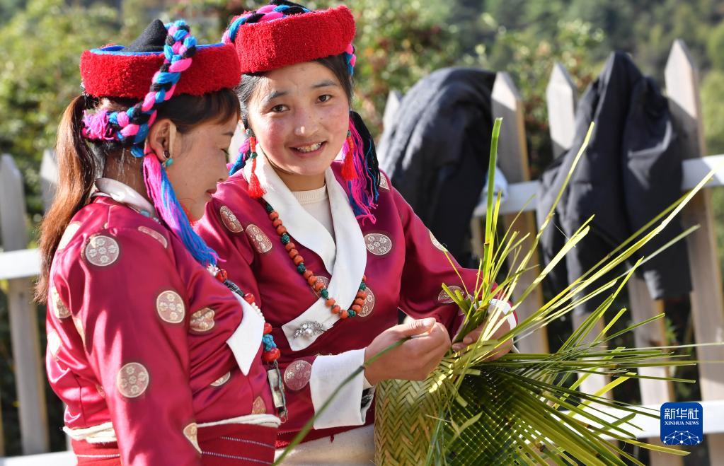 勒布溝的門巴族婦女在編織竹筐。新華社記者 覺果 攝
