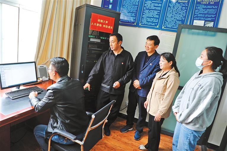 圖為墨竹工卡縣人大常委會黨組書記、主任張志文(左三)和人大代表一起回訪,了解尼瑪江熱鄉(xiāng)中心小學更換的廣播系統(tǒng)使用情況。記者 格桑倫珠 裴聰 攝